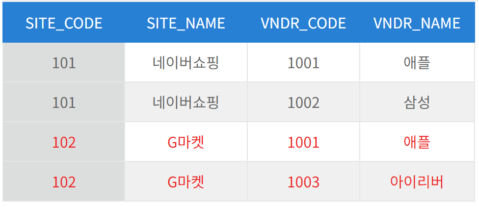 이렇게 나온 '네이버쇼핑'과 'G마켓'이 합쳐진 테이블에서 업체가 '애플'인 데이터만 추출하기 위해서는 어떻게 해야할까? 아래와 같이 나타낼 수 있다.
