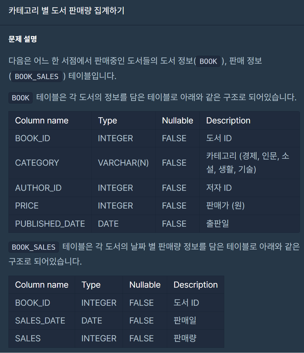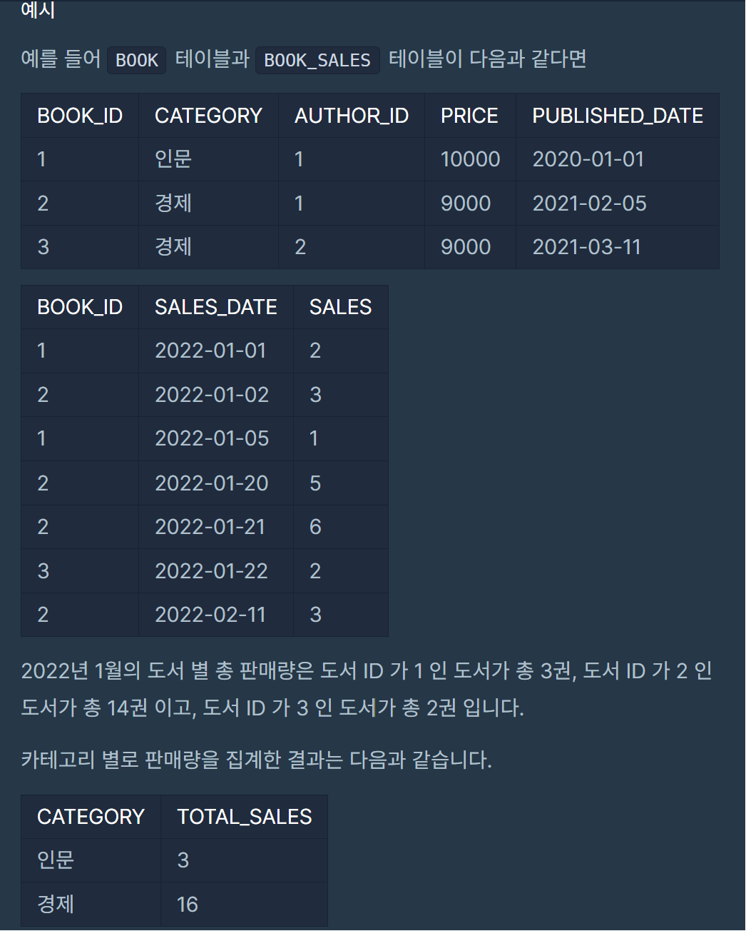 2. BOOK 테이블과 BOOK_SALES 테이블은 BOOK_ID 컬럼으로 JOIN 하여 각 도서의 판매정보를 가져온다. 이때 OUTER 조인이 아닌 INNER 조인을 사용한다. 두 테이블 간의 관계가 일치하기 때문에 OUTER JOIN이 아니라 INNER JOIN을 사용했다.