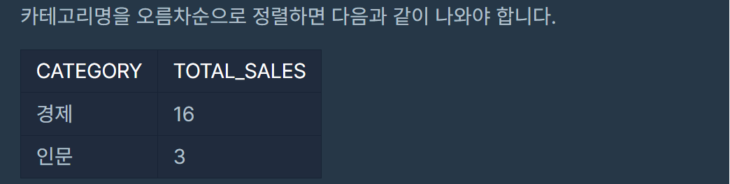 5. 컬럼은 1) CATEGORY와 2) SLAES의 합을 알 수 있도록 SUM()함수를 사용한 SUM(SALES)를 사용하였고 별칭으로 TOTAL_SALES를 주었다.