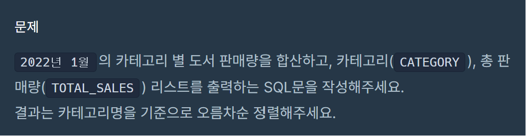 3. 조건이 2022년 1월의 카테고리 별 도서 판매량이므로 날짜를 추출하여 사용할 수 있도로 EXTRACT()함수를 사용하였다. (참고 : [Oracle] 날짜정보 추출 함수 / EXTRACT )