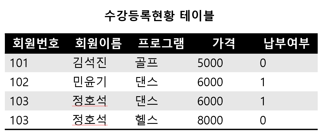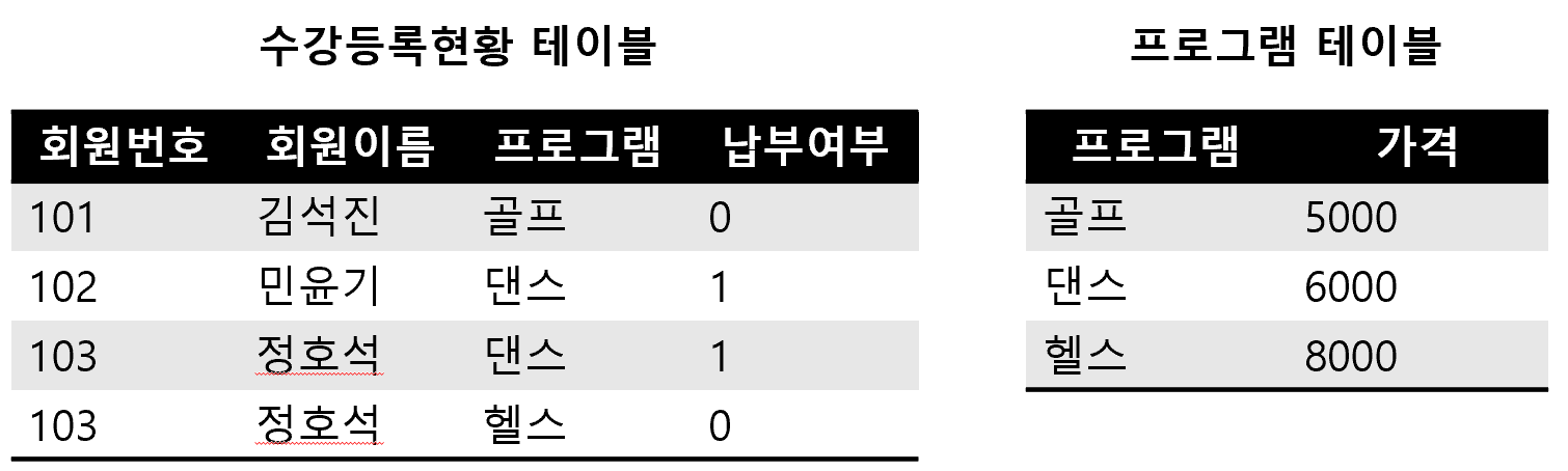 프로그램의 댄스 가격을 수정한다고 한다면, 수강등록 현황 테이블에서 수강회원들의 댄스 프로그램의 가격을 모두 수정하는 번거로움 없이, 프로그램 테이블에서 댄스 프로그램의 가격만 변경해주면 된다.