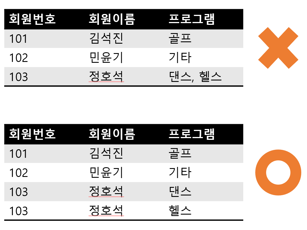 제 1정규화 : "한 칸엔 하나의 데이터만" => 제 1 정규형 테이블