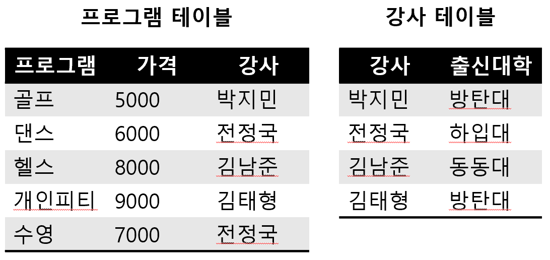 위의 프로그램 테이블, 강사테이블은 제 3정규형을 만족하는 테이블이다.
