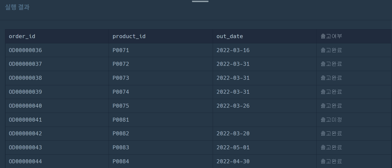 SELECT ORDER_ID, PRODUCT_ID, OUTDATE, "출고여부"