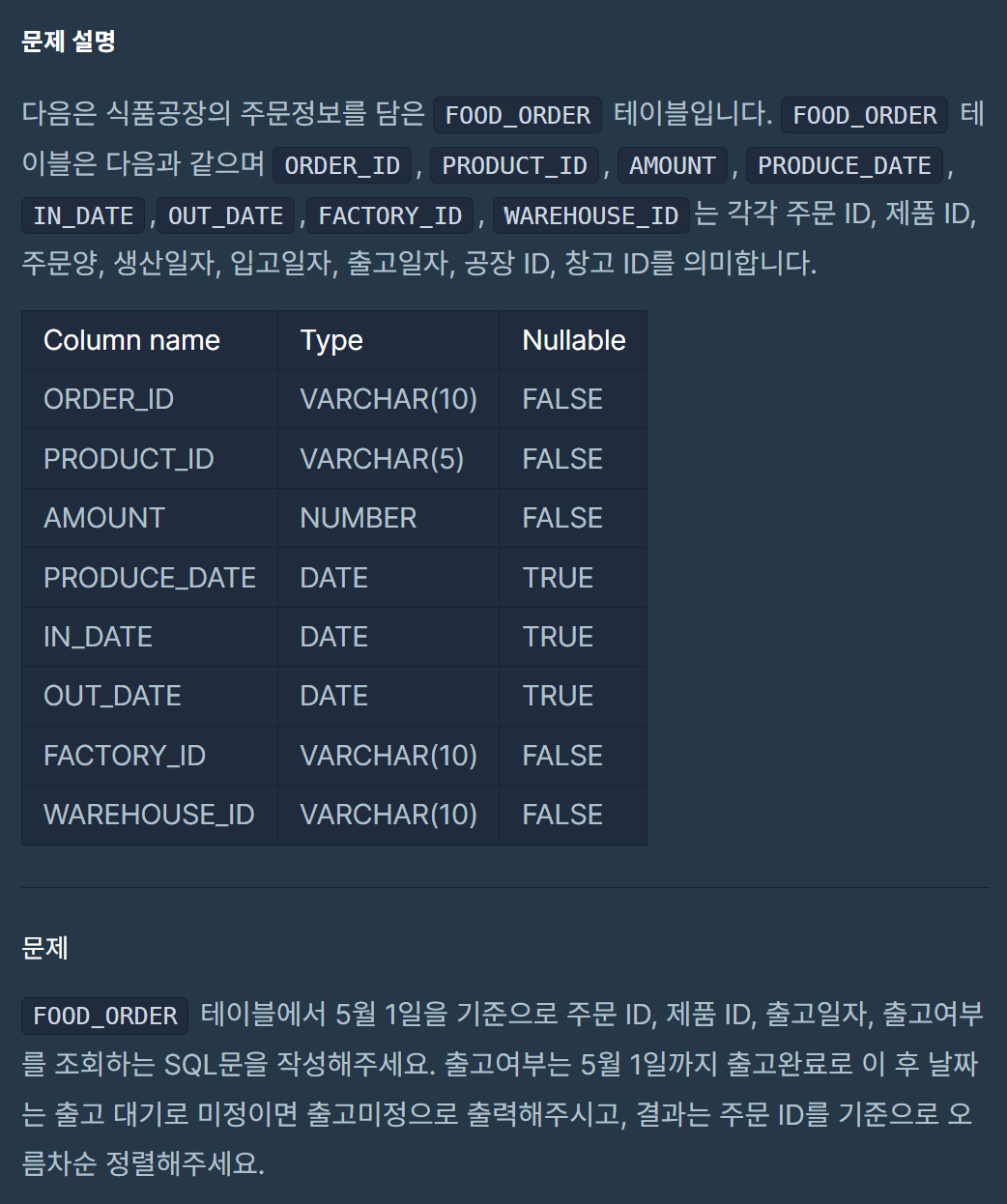 FOOD_ORDER 테이블에서 5월 1일을 기준으로 주문 ID, 제품 ID, 출고일자, 출고여부를 조회