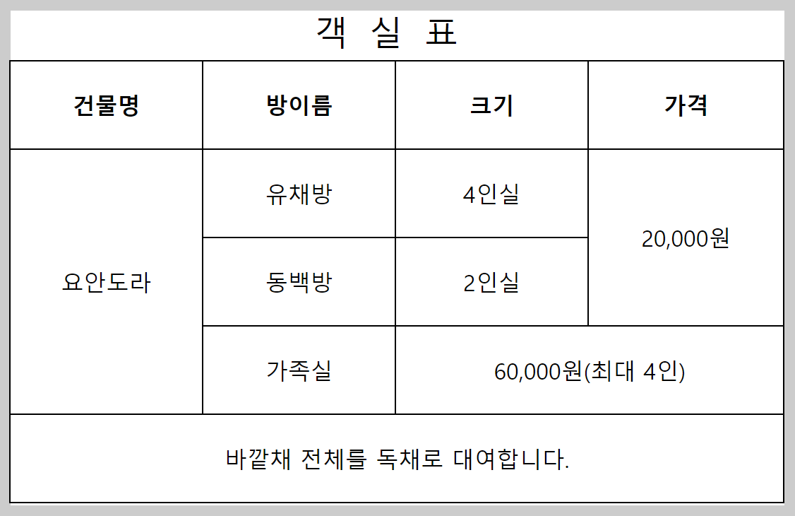 <td colspan="4">바깥채 전체를 독채로 대여합니다.</td>