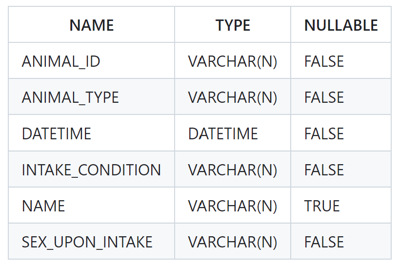 ANIMAL_INS 테이블은 동물 보호소에 들어온 동물의 정보를 담은 테이블입니다. ANIMAL_INS 테이블 구조는 다음과 같으며, ANIMAL_ID, ANIMAL_TYPE, DATETIME, INTAKE_CONDITION, NAME, SEX_UPON_INTAKE는 각각 동물의 아이디, 생물 종, 보호 시작일, 보호 시작 시 상태, 이름, 성별 및 중성화 여부를 나타냅니다.
